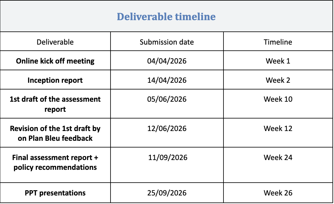 All deliverables mentioned in the table above have to be sent to Plan Bleu in English. The deliverables have to be formally approved by Plan Bleu. No payments will be made without prior approval of the linked deliverables.